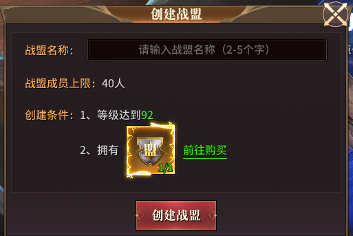 创建条件:1、等级达到92级 2、拥有一个“战盟令”