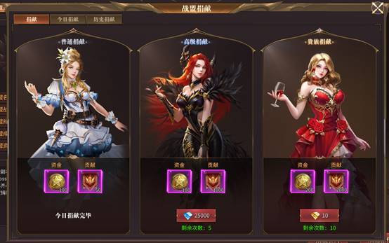 玩家通过战盟捐献可以获得战盟资金和战盟贡献,资金用于升级战盟,战盟贡献可以在战盟商城兑换各种材料和道具。